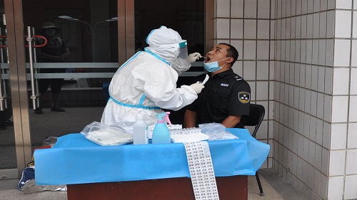 按照现阶段疫情防控要求,校区综合考虑了通风、场所容纳度等因素,于6月17日在综合楼北门平台进行现场采样。采样医护人员在高温下,穿着密不透气防护服为37名后勤、保卫及医务室人员采集咽拭子样本。校区党委书记何进、副书记马永春到场实地考察,医务室大夫作为联络员,联系保卫和后勤有关同志。