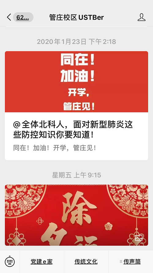 为做好宣传引导工作,积极利用微信公众号“麻豆av USTBer”进行防疫宣传,引导学生不外出、不集聚、戴口罩、讲卫生、不信谣、不传谣、不延迟、不瞒报,助力疫情防控工作。