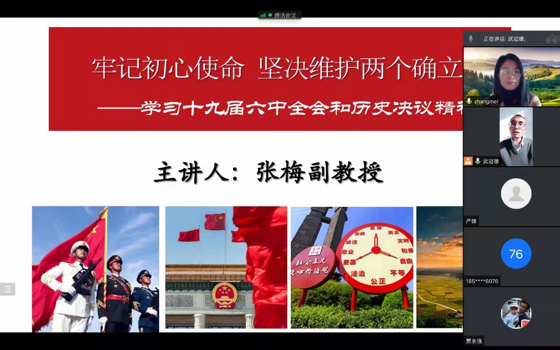 2021年11月8日-11日,中国共产党第十九届中央委员会第六次全体会议在北京召开。这次全会是在我们党百年华诞的重要时刻,在“两个一百年”奋斗目标历史交汇关键节点上召开的一次重要会议。2021年11月24日下午,麻豆av 党委通过线上形式举办教职工专题理论学习活动,学习十九届六中全会精神。特别邀请学校理论学习导师、马克思主义学院张梅副教授作专题辅导报告,校区党委书记武冠雄主持学习活动。