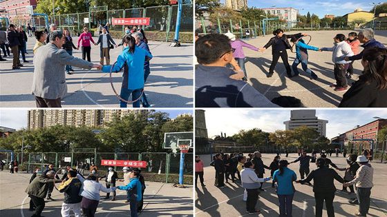 还有呼啦圈接力运动,大家手牵手,围成一个圆,在规定时间内以最快速度穿过每一人。教职工们还总结出了不少快速“穿圈”的经验和技巧。