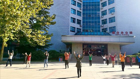 “第八套广播体操正式开始。第一节,伸展运动,一二三四……”。每个工作日上午9点50分,校区工会会员准时齐聚在综合楼前跟随着音乐,开始舒展身体。老师们个个神情专注,一边耐心练习,一边在运动中领会工间操的益处和魅力。伸展、弯腰、踢腿、跳跃,每个动作都力求标准到位、刚健有力。大家昂扬向上的精神风貌、整齐划一的动作成为校区一道靓丽的风景线。