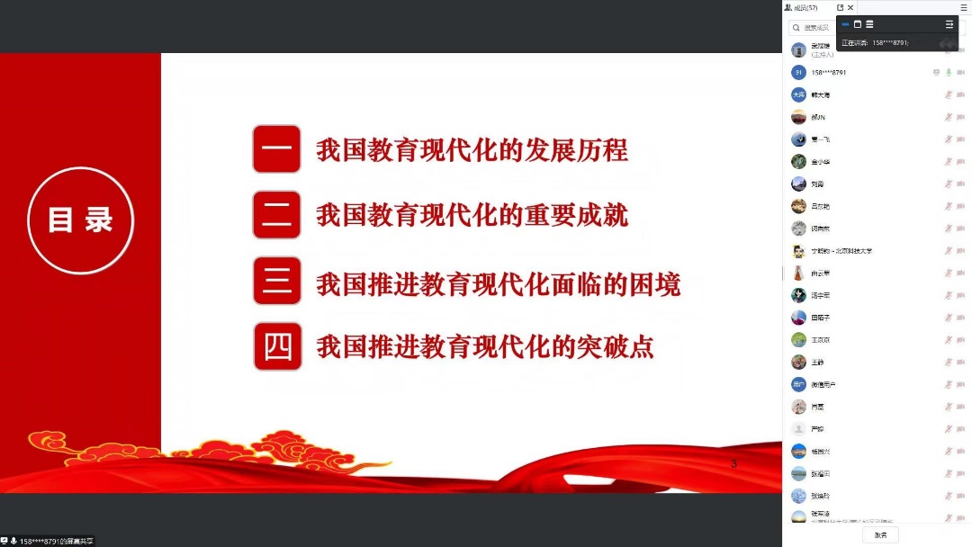 张红霞以《加快推进教育现代化 建设教育强国——深入学习贯彻党的二十大精神》为主题,从四个方面对我国教育事业的发展、新时代党和国家对教育事业的总体布局和奋斗目标等重点进行了详尽、系统的解读。一是我国教育现代化的发展历程;二是我国教育现代化的重要成就;三是我国推进教育现代化面临的困境;四是我国推进教育现代化的突破点。