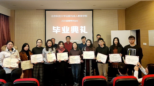 2020年1月11日上午,远程与成人教育学院2020届春季业大生毕业典礼在综合办公楼509举行。校区院长宁晓钧、副院长张军凌、校友会主任马轶民、教师代表闫宏伟和近一百名毕业生参加了典礼。