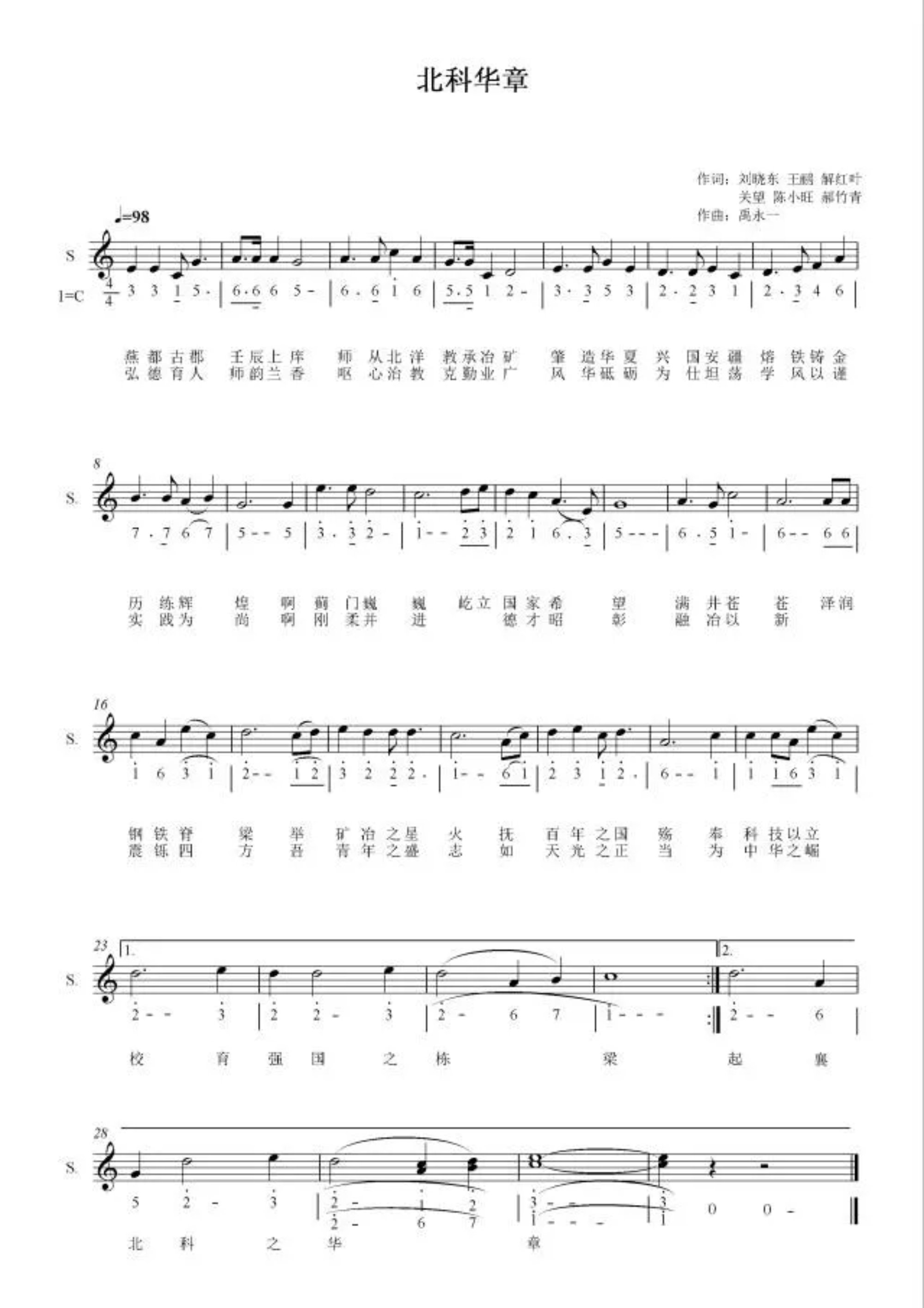 《北科华章》由校团委师生集中力量创作而生,以学校历史积淀与展望为主要内容,恢弘大气的曲调和精炼务实的文词风格展现着代代北科人的神采风貌。词作者为刘晓东、王鹂、解红叶、陈小旺、关望、郝竹青,曲作者为中国音乐学院禹永一教授。